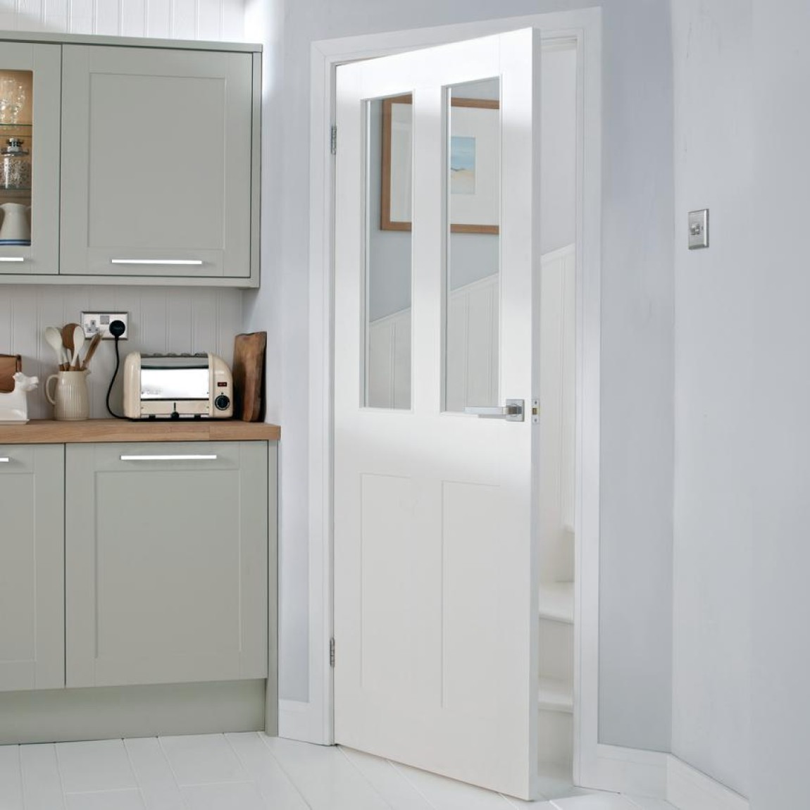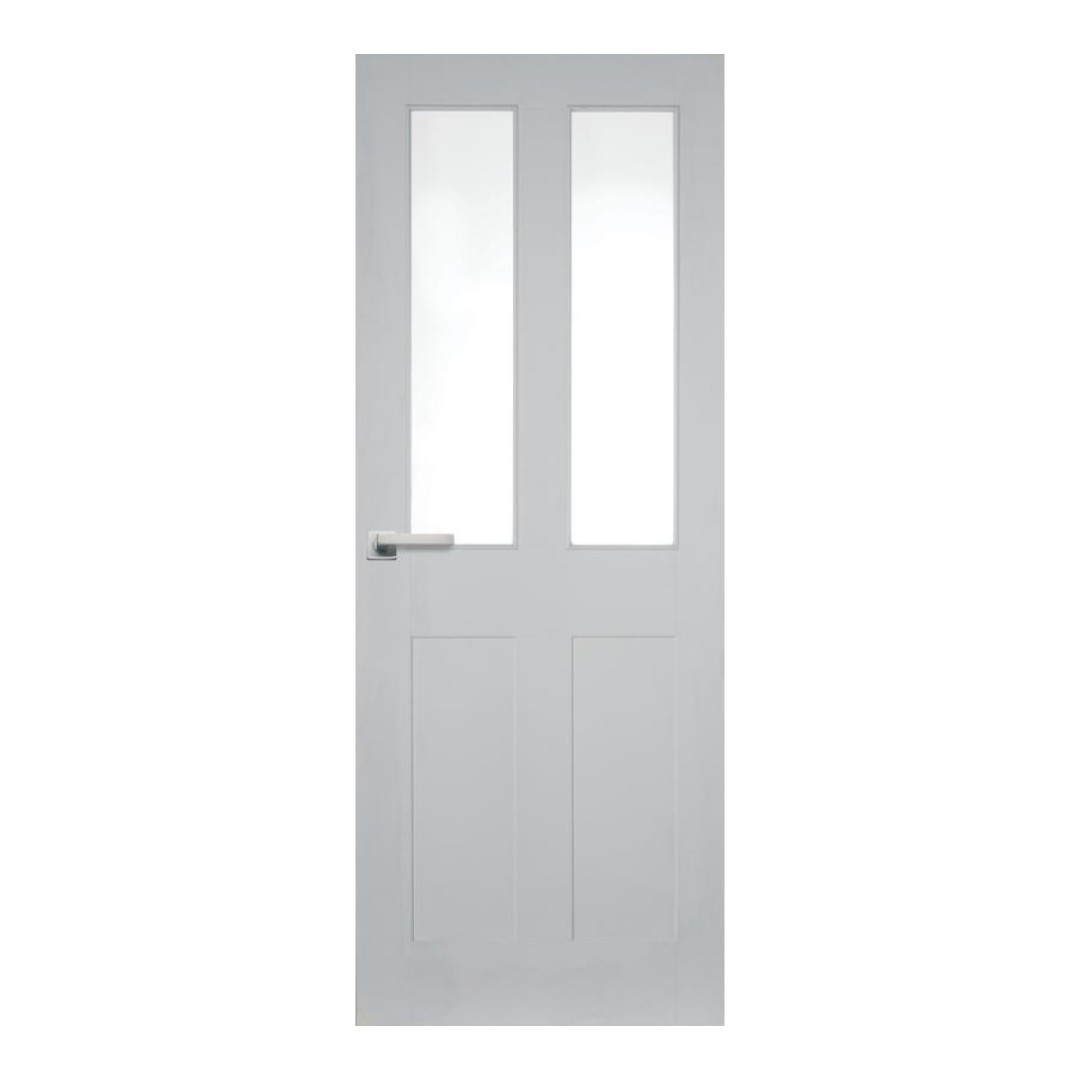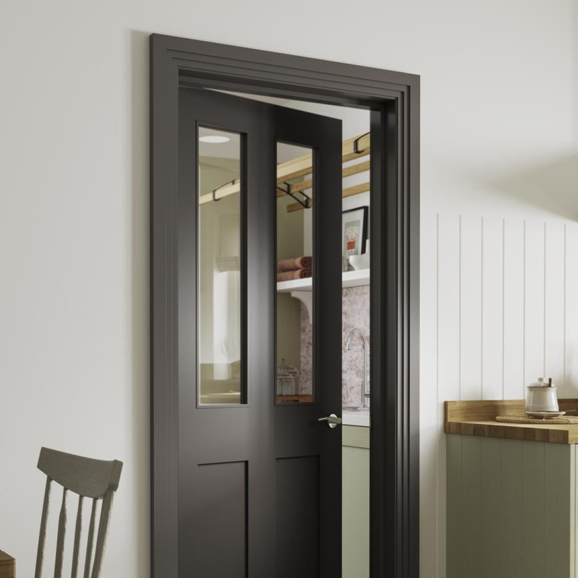 This angular, contemporary door design perfectly complements our Burford range of skirting, architraves, and handles. The door features four moulded panels, with the top two replaced by glazing to enhance natural light and brighten your space. Manufactured in the UK, it is also available in a wider version, ensuring improved accessibility without compromising on style.