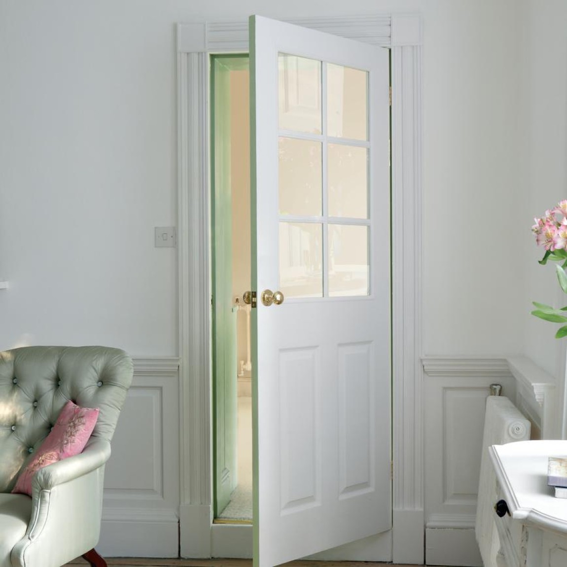 Features glazed panels that allow natural light to flow between rooms, creating a brighter and more open feel. The glass is securely fitted for durability while adding a touch of elegance to any space.