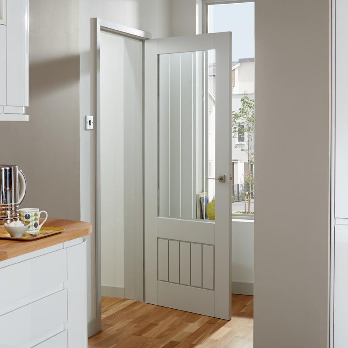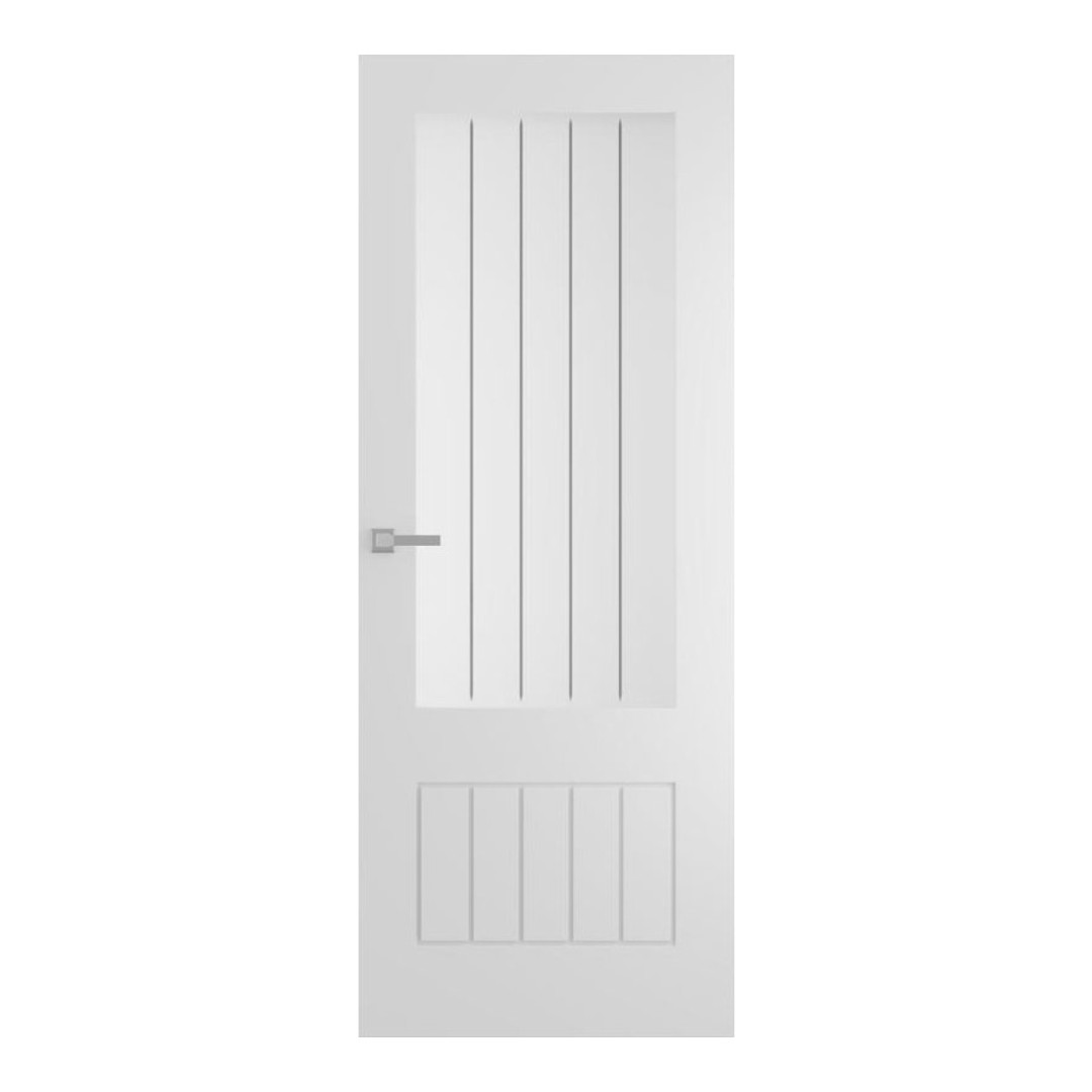 Etched with subtle vertical lines to mirror the tongue-and-groove detail below, the glass adds visual continuity and style. The door is supplied primed and ready to paint, making it easy to customise and saving time on finishing. A lightweight yet stable particleboard core ensures easy handling, and multiple widths are available for a precise fit.