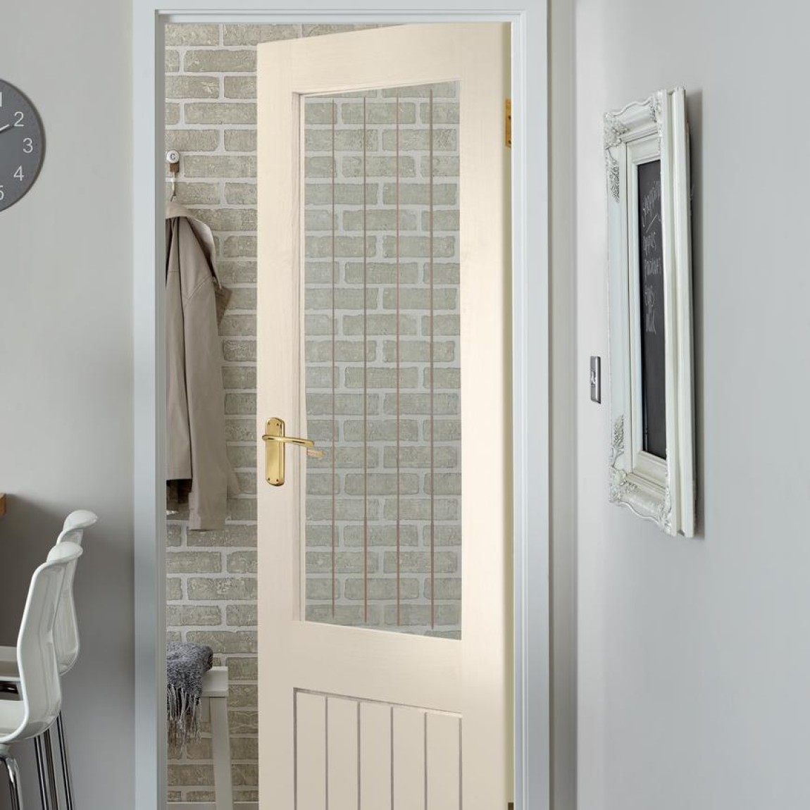 Features glazed panels that allow natural light to flow between rooms, creating a brighter and more open feel. The glass is securely fitted for durability while adding a touch of elegance to any space.