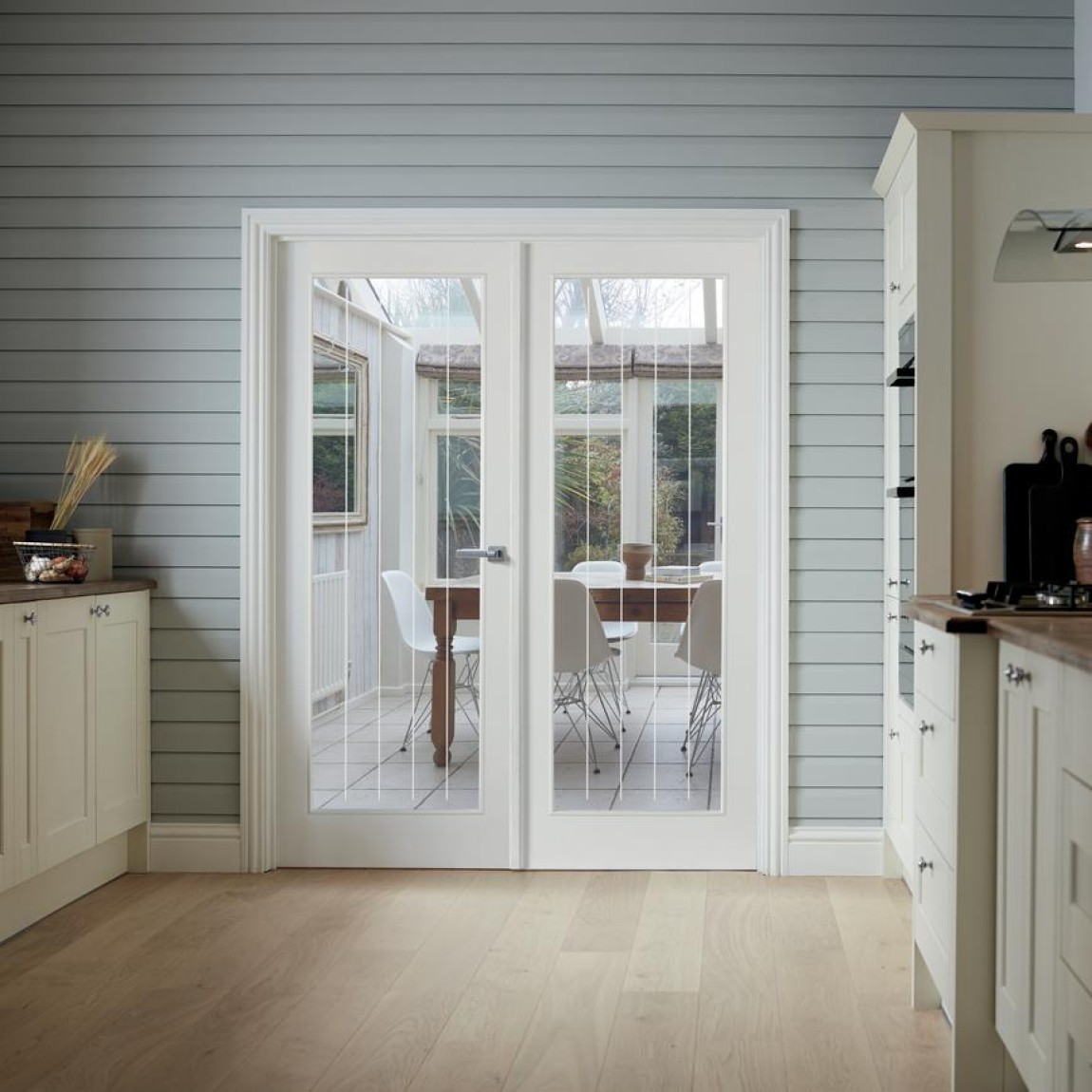 A large glazed panel allows light to flow between rooms, while etched vertical lines on the glass echo the classic tongue-and-groove design for a subtle, modern touch. Supplied pre-finished for quicker installation, it’s available in a range of widths to suit various layouts.