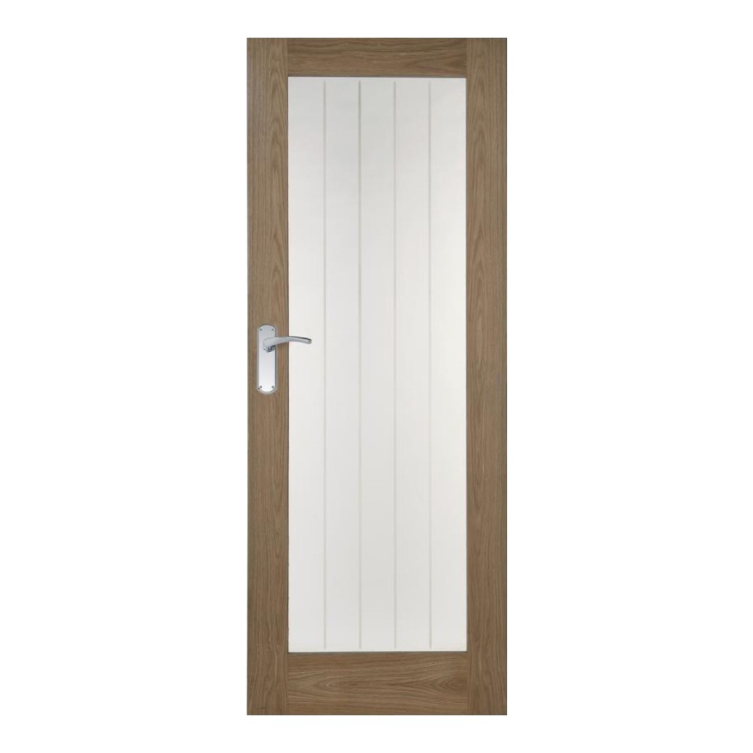 The glazed version of our Genoa Oak door features a large pane of toughened, etched glass, offering a versatile and modern aesthetic while allowing plenty of natural light to brighten your space. The etched vertical lines echo the tongue-and-groove design characteristic of the Genoa range, adding a subtle, stylish detail. Supplied ready to finish, it can be customised with varnish, stain, or Osmo Oil to suit your interior decor.