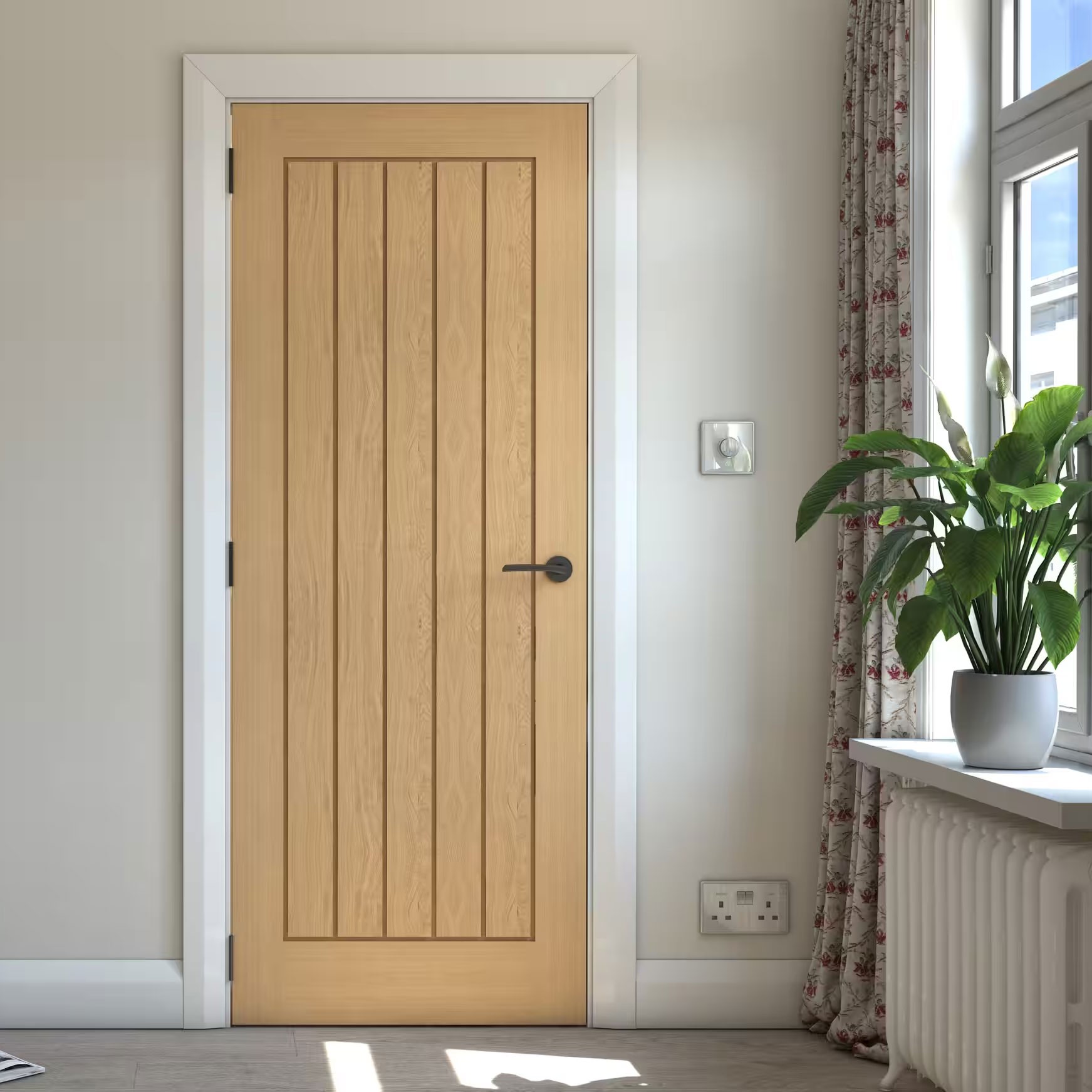 Elegant and timeless, the prefinished Mexicano Oak remains one of the most sought-after cottage-style doors available today. Built with a solid core for durability, it is finished with a bold-grain A-grade American white oak veneer that adds warmth and natural texture. Defined by its deep V-grooves, this premium internal door carries a distinctive character that sets it apart.