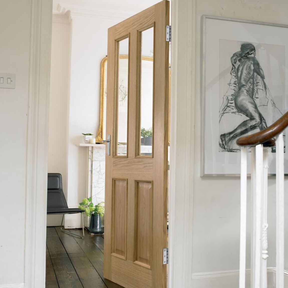Our four-panel glazed doors offer the timeless elegance of oak tones, featuring two large bevelled glass windows that brighten and open up any space. The clear glass is pre-installed for your convenience, allowing for a quick and easy fitting. Finish the doors with varnish or stain to enhance the natural beauty of the wood and ensure it stays looking its best for years to come.