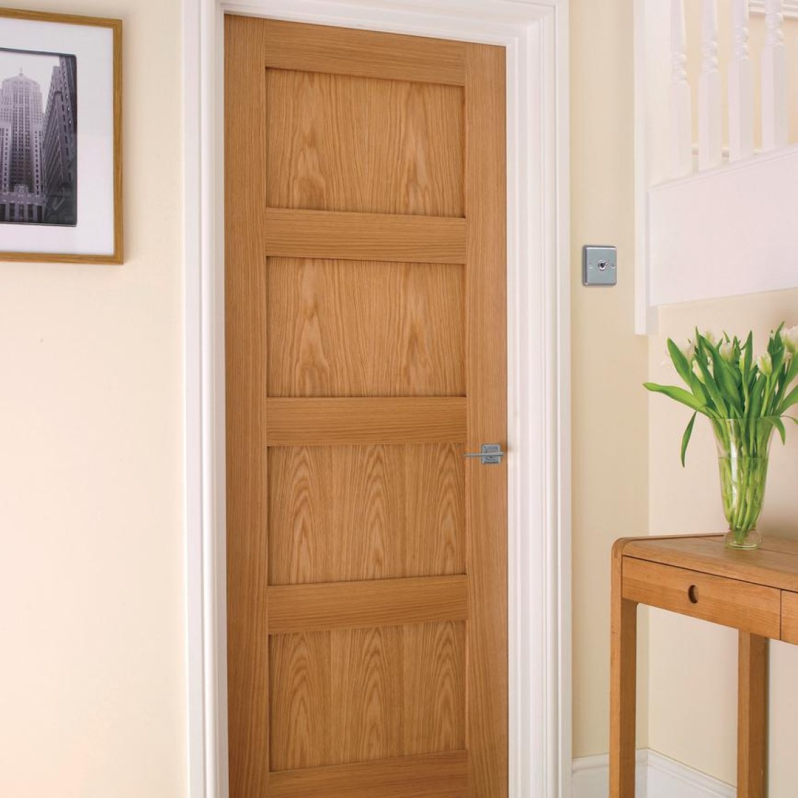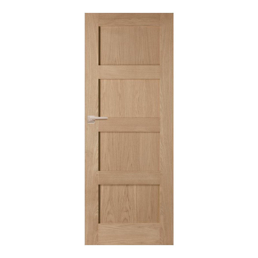 Featuring four vertically arranged panels, this Shaker-style door offers a modern aesthetic that complements a wide range of interior designs. Constructed with an engineered core and finished with an oak veneer, it provides enhanced stability compared to solid wood. Fire-rated and accessible options are also available, making it a versatile choice for any space.