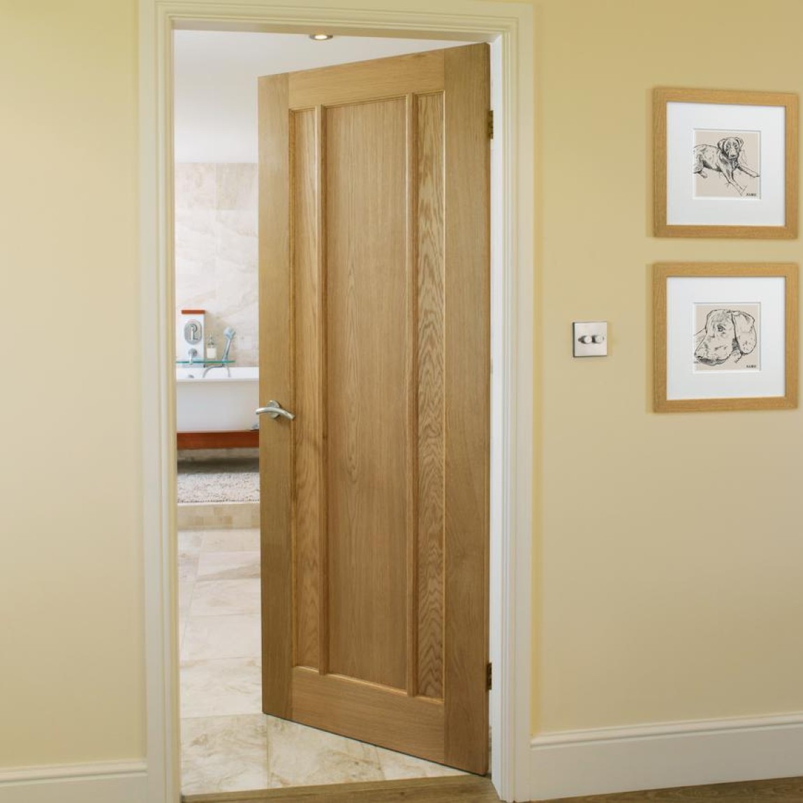 This premium oak door features a classic panel design that adds an air of sophistication to any space. Built with an engineered core to prevent warping, it also comes in fire door variants for added safety. The outer surface is crafted from American white oak, showcasing beautiful pale wood tones and natural grain patterns, offering both style and durability.
